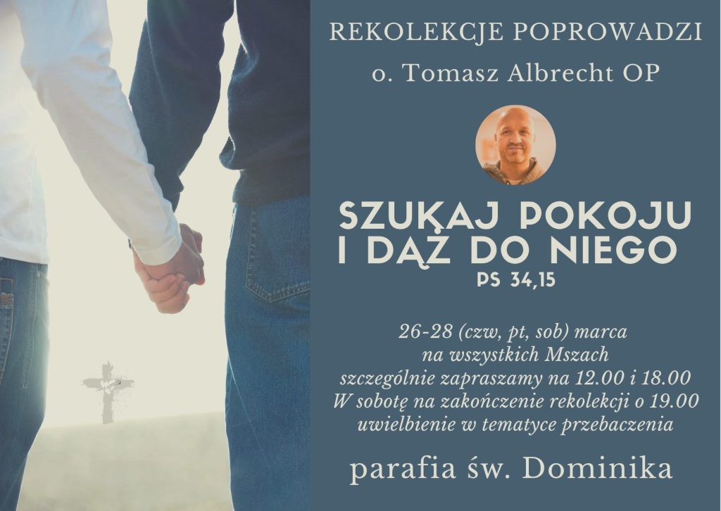 Drodzy parafianie dziś rano zadzwonił do mnie ks. Sławomir Małkowski z informacją, że bardzo się rozchorował i nie jest w stanie przyjechać na rekolekcje. Po poszukiwaniach przyjedzie do nas nasz brat, dominikanin, którego dobrze znacie o. Tomasz Albrecht OP. Chwała Panu! Rekolekcje rozpoczną się w czwartek od Mszy o 12.00. Póżniej tak jak planowaliśmy. Proszę Was o modlitwę za zdrowie dla ks. Sławomira. Jeszcze raz wszystkich Was gorąco zapraszam 🙂