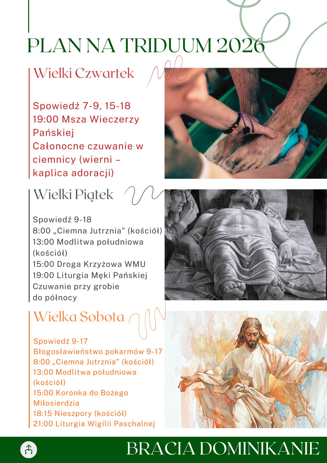 Zapraszamy do wspólnego przeżywania Triduum Paschalnego – najważniejszych dni w roku liturgicznym. To czas zatrzymania, modlitwy i wejścia głębiej w tajemnicę męki, śmierci i zmartwychwstania Chrystusa. W naszym kościele chcemy stworzyć przestrzeń zarówno dla wspólnotowego świętowania liturgii, jak i dla osobistej refleksji oraz ciszy.